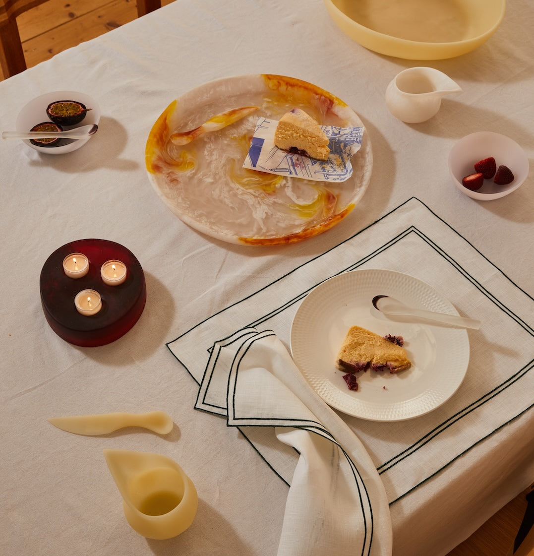 Janneke is inspired by design, sculpture and humanity, and hopes these influences are recognised in her collections of sculptural resin homewares and table textiles.